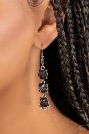 A trio of bold smokey rhinestones, set in pronged silver fittings, stack one above the other. The center rhinestone is almost imperceptibly square rather than round and the final rhinestone is accented with a gritty metallic crescent etched with ropelike texture, creating a ruggedly glamorous lure. Earring attaches to a standard fishhook fitting.