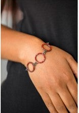 Encrusted in fiery red rhinestones, three glittery gunmetal rings link across the wrist for a glamorous look. Features an adjustable clasp closure.
