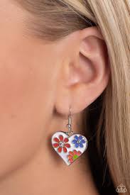 A colorful floral pattern of Burnt Sienna, coral, and Persian Jewel flowers with white rhinestone centers, and a Leek Green center is painted across the front of a white-painted heart backdrop, creating a colorful statement lure. Earring attaches to a standard fishhook fitting.