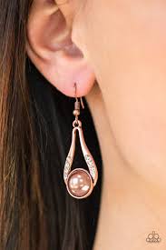 A pearly copper bead is nestled along the bottom of an elegant copper frame radiating with glassy rhinestones for a timeless look. Earring attaches to a standard fishhook fitting.