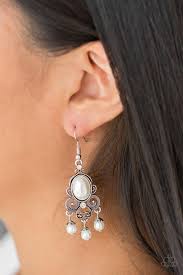 Dotted silver filigree spins around a pearly white bead and dainty white rhinestones, coalescing into a regal frame. A pearly fringe swings from the bottom of the frame for a refined finish. Earring attaches to a standard fishhook fitting.