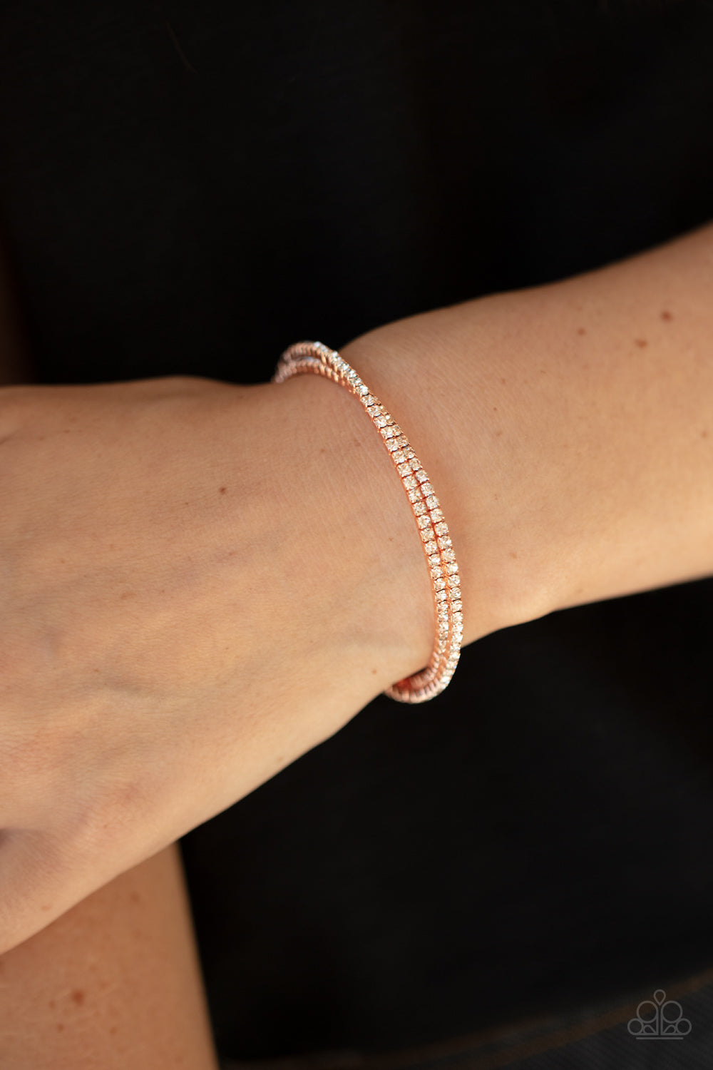 Featuring shiny copper fittings, two rows of glassy white rhinestones delicately twist into a dainty cuff around the wrist.