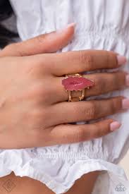 Featured atop airy gold bands, a pink geode stone with druzy-like accents is encased in gold foiling for a decadently earthy centerpiece atop the finger. Features a stretchy band for a flexible fit. As the stone elements in this piece are natural, some color variation is normal.