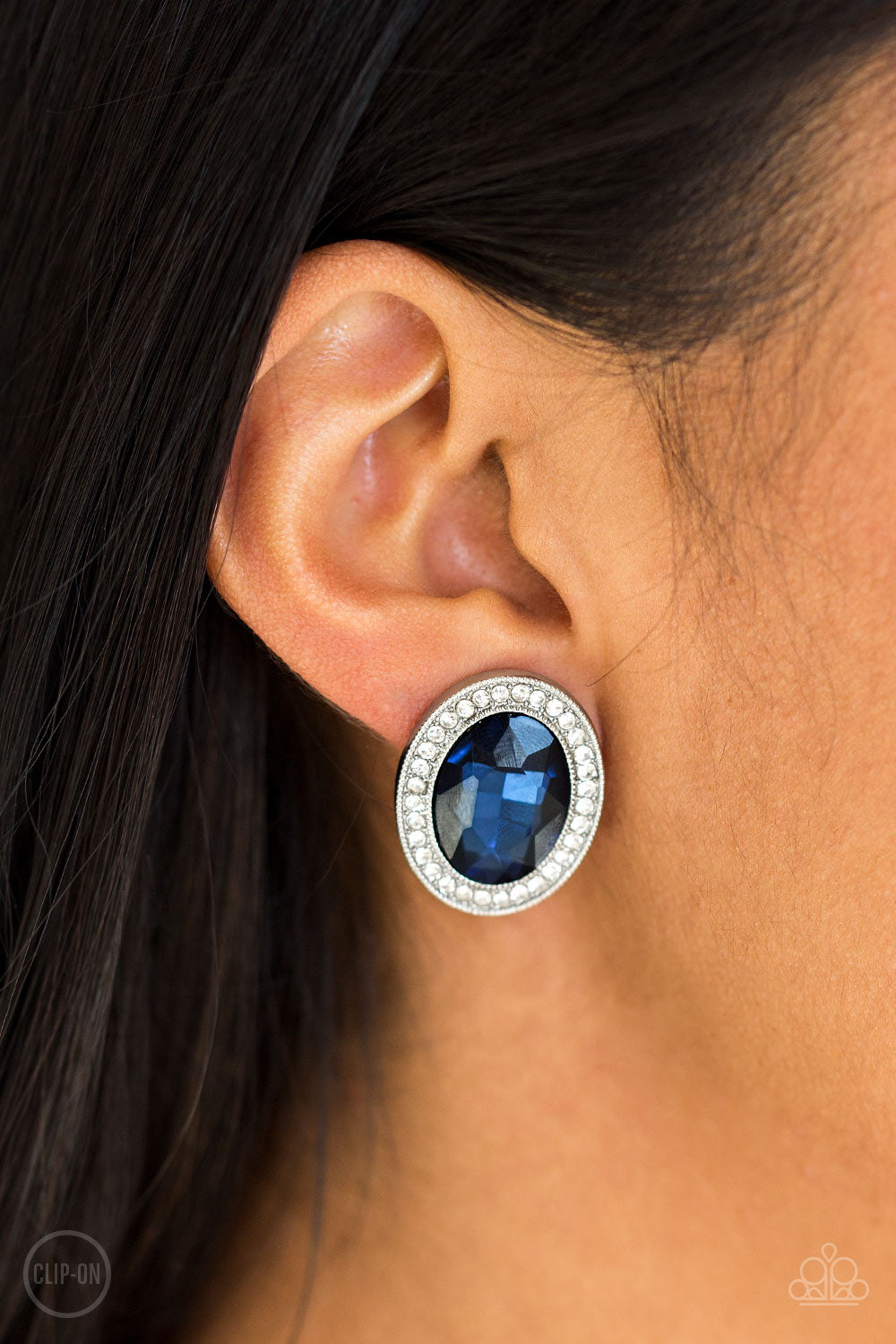 An oversized blue gem is pressed into the center of a silver frame radiating with glassy white rhinestones for a glamorous look. Earring attaches to a standard clip-on fitting.