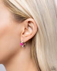 Connected to a silver hinge hoop, a strip of white paint curls towards the front of the ear, proudly displaying the Pink Peacock-painted dainty heart at its center for a romantic statement. Earring attaches to a standard hinge closure fitting. Hoop measures approximately 1/2" in diameter.