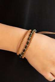 Infused with dainty silver beads, a strand of green wooden beads layers with two braided rows of twine-like cording around the wrist for a colorfully layered look. Features an adjustable sliding knot closure.