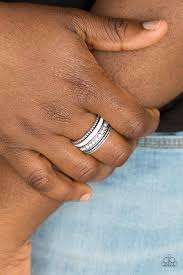 A shiny white strip of color runs along the bottom of a row of glassy white rhinestones. Infused with silver textures, the mismatched details coalesce into one thick band across the finger. Features a stretchy band for a flexible fit.