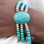 Layers of turquoise beads are threaded along stretchy bands that connect to a stunning oval turquoise stone, creating an extraordinary statement piece around the wrist.
