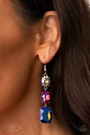 An iridescent blue emerald style gem swings from the bottom of a mismatched pair of iridescent oval rhinestones, creating a stellar lure. Earring attaches to standard fishhook fitting.